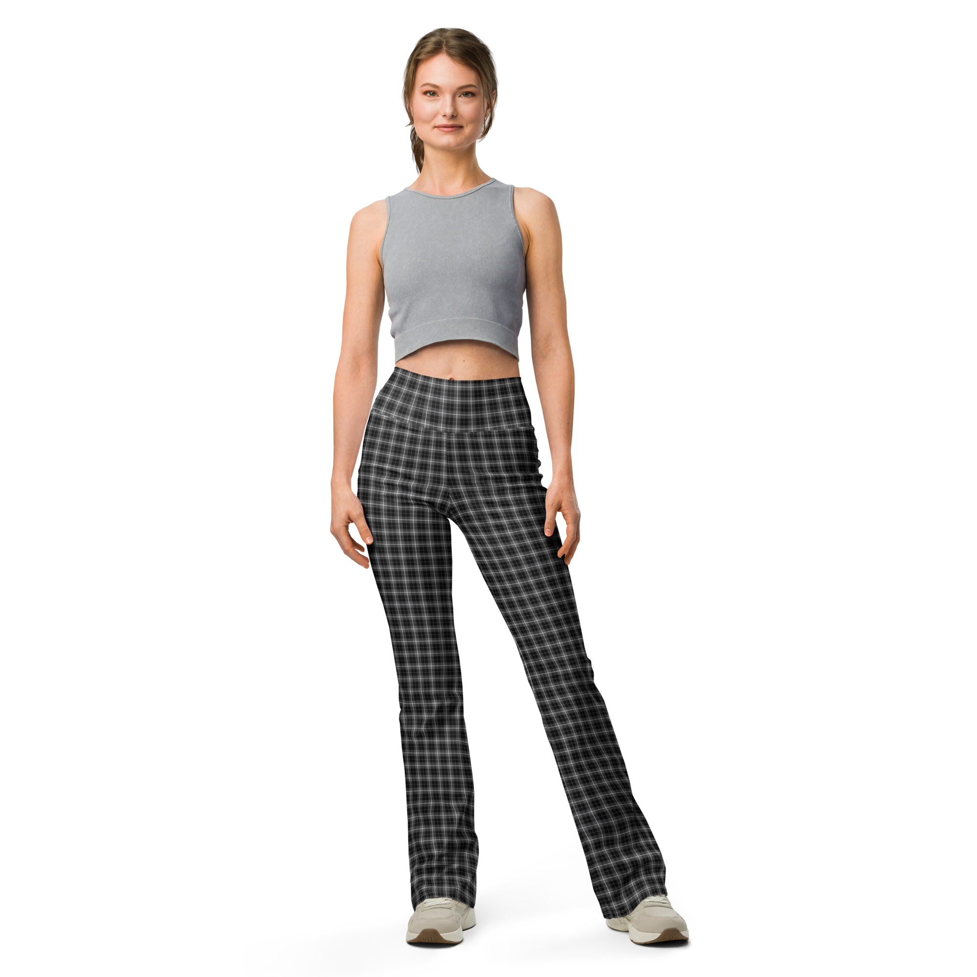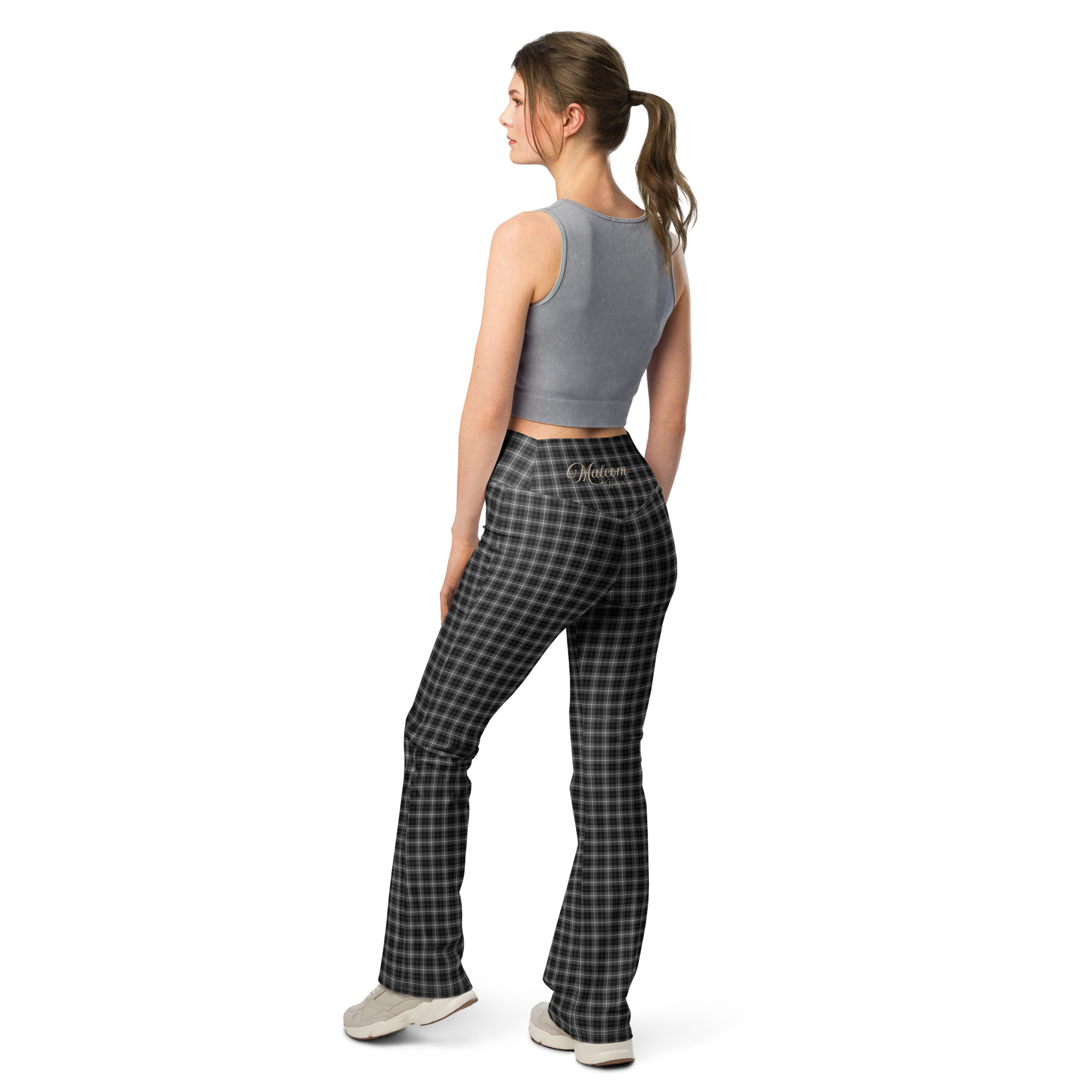 Designed to enhance your figure, these trendy leggings feature a high waist and a butt-lifting cut. The flared leg bottoms add a touch of style and make the leggings comfortable. Wear them on a walk, to the gym, or style them up with a bomber jacket or hoodie.